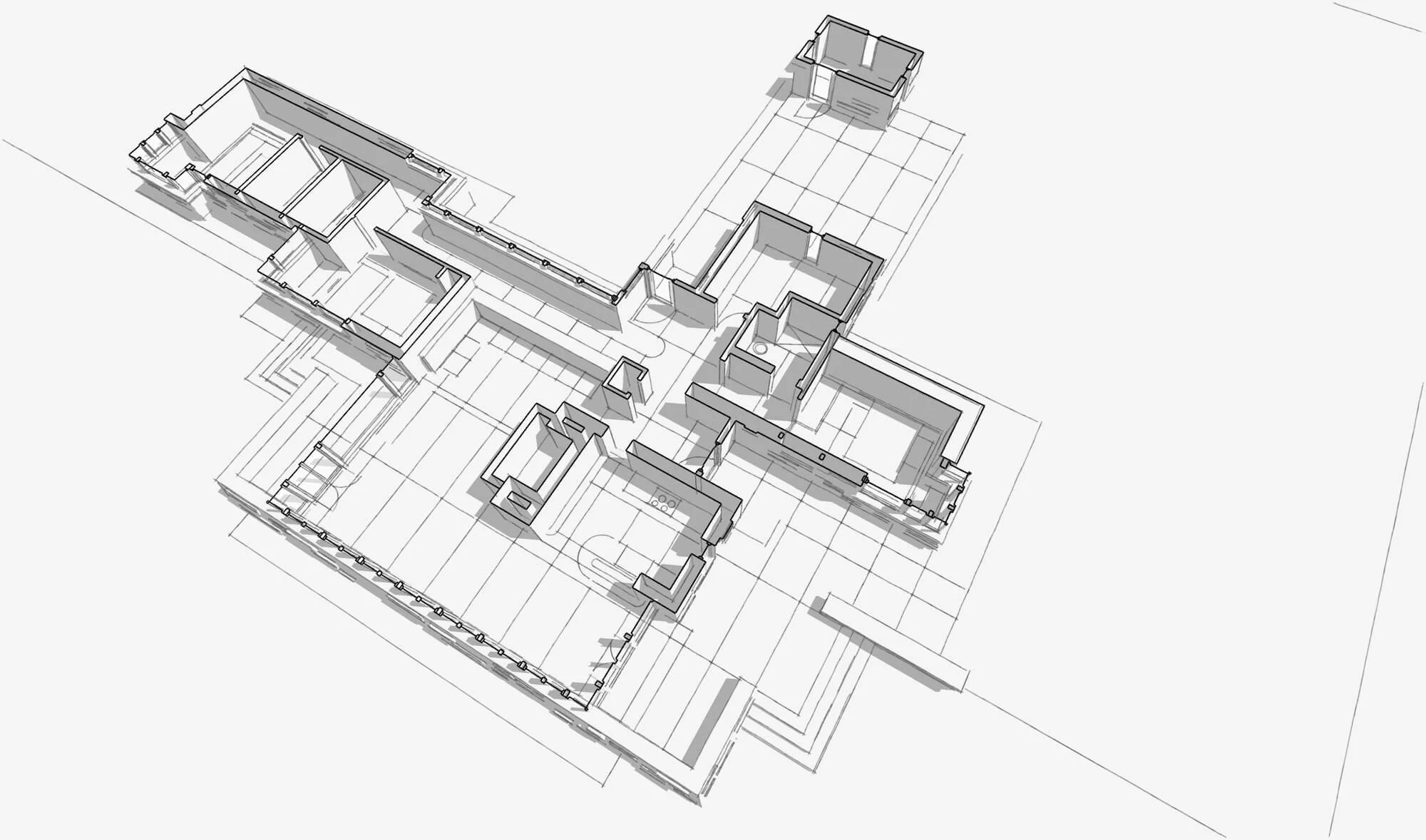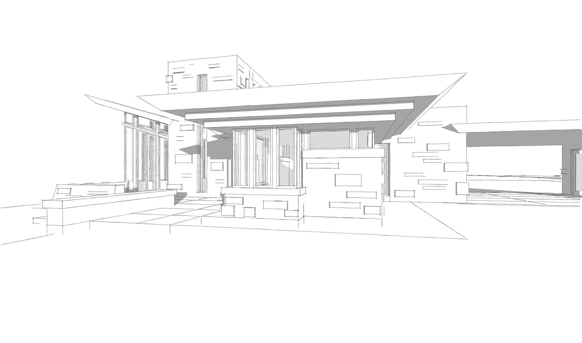 Extending from this central space, I developed two in-line wings using Wright's Usonian principles: private master suites on one side and separate guest quarters on the other. These additions maintained the original design language while creating distinct zones for privacy and hospitality. The low-slung rooflines and strategic window placement emphasized the home's integration with its lakeside setting.
